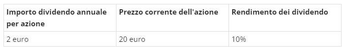 Il rendimento dei dividendi si ottiene dividendando l'importo del dividendo annuale per azione per il prezzo dell'azione e moltiplicando il risultato per 100. Ad esempio, se l'importo del dividendo annuale per azione è di 2 euro e il prezzo corrente dell'azione è di 20 euro, il rendimento dei dividendi sarà del 10% (2/20 * 100).