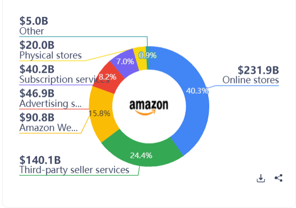Partiamo con l?e-commerce, che ad oggi costituisce il 40.3% delle Revenue di Amazon, come si vede dallo spaccato del fatturato qui sotto.