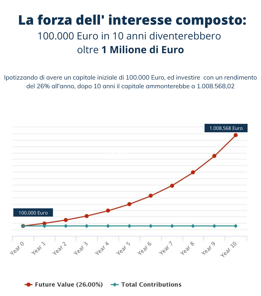 Tutto merito dell?interesse composto, che permette una crescita esponenziale (anzichè lineare) del capitale.