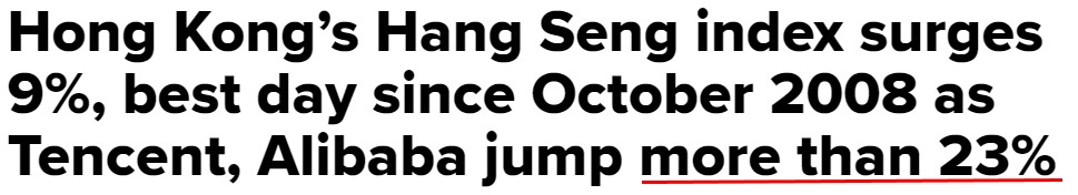 a Marzo 2022 è bastata una notizia del Vice-premier Cinese che si dichiarava disposto a sostenere la crescita delle aziende ?per far balzare in alto tutti i titoli della Borsa Cinese, con aziende come Alibaba ( di cui noi del War Street Club siamo azionisti) che hanno guadagnato il 23%... in un solo giorno!