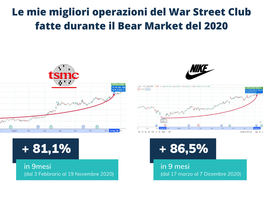Durante il crollo dei mercati, a Marzo 2020, dovuto allo scoppio del Covid, abbiamo comprato a prezzi (scandalosamente) bassi tutta una serie di azioni che sono poi risalite nei mesi successivi, regalandoci guadagni fino al 86,5% in pochi mesi.