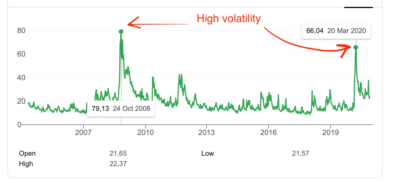 In generale, i prezzi delle azioni salgono gradualmente,  ma come abbiamo visto prima ci sono  anche periodi di ribasso (correzione e Bear markets) i quali sono spesso accompagnati da oscillazioni di prezzi più importanti e più repentine; causando per l?appunto una maggior volatilità sui mercati.