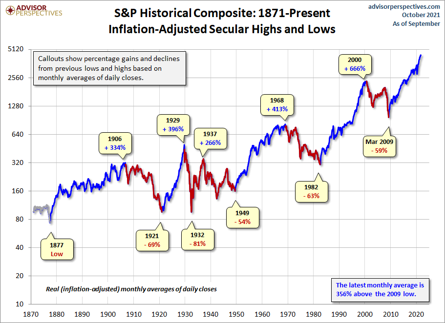 Nell'immagine qui sotto puoi vedere tutti i Bear Markets (contrassegnati in rosso) dell'indice Americano S&P 500, alternati ai periodi Bull Market (in blu).