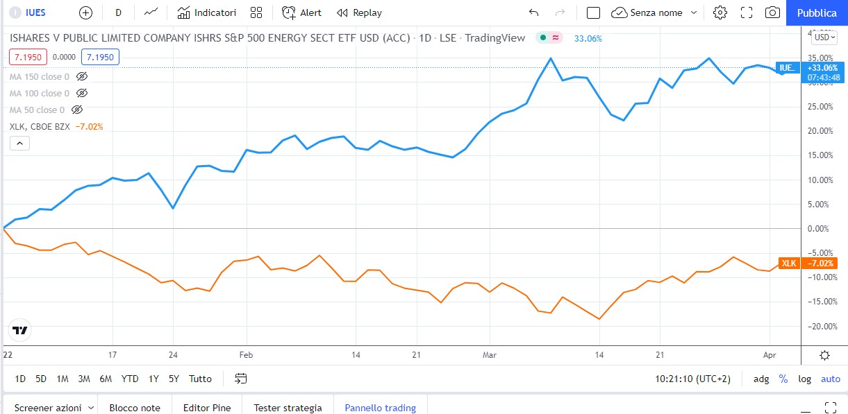 Facciamo un confronto tra un ETF che replica l?andamento del settore energetico Americano (IUES in colore giallo) e quello del settore Tecnologico ( XLK in colore azzurro).
